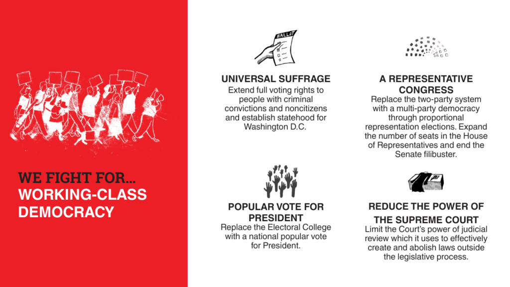Workers, instead, only gain power and knowledge by working together and pooling experience to overcome the concentrated wealth of the rich. To foster that collective strategy, the Electoral Working Group has selected a group of short articles that new members ought to read to help build a common understanding of the challenges socialists face and the solutions we have to fight for Democratic Socialism. In addition to our introductory reading, we have further readings that are not required but helpful in learning how to build Socialism in the electoral struggle. The electoral struggle is but one of many tools for the fight for Democratic Socialism, so we encourage comrades to learn about labor and tenant organizing too, however that is outside the scope of this page.