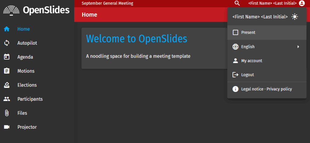 Once you’ve selected a meeting you can click your name in the upper-right corner and mark yourself present. This will allow you to vote and make motions.