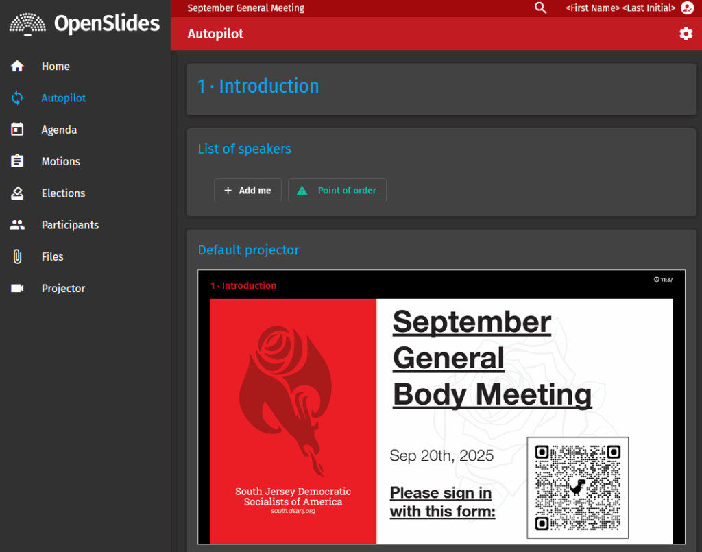 SJ DSA will be moving to OpenSlides for our general meeting starting October 2025. This page should show you everything you need to know and how to participate.